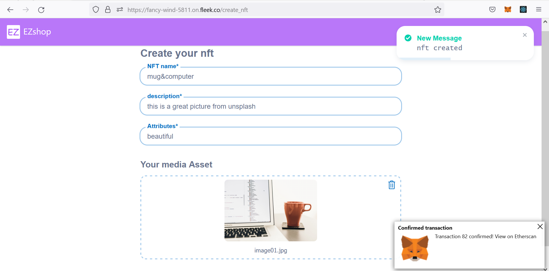 EZshop is a decentralized application using Web3.0 technologies. The ultimate goal is to make it a NFT marketplace like OpenSea. Right now some main functionalities have been implemented, and I am still working on some other issues or challenges, please go to github repo to see more details, thank you!